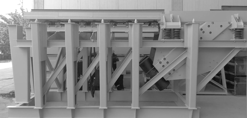 Un alimentador de placas reciprocantes consta de un bastidor con una gruesa placa de chapa de acero resistente al desgaste en la parte superior. El bastidor con la placa se mueve hacia adelante y hacia atrás con la ayuda de un pistón hidráulico. Cuando la placa avanza, el hueco del extremo posterior se llena de material y cuando la placa retrocede se descarga una parte del material. El bastidor se asienta sobre un conjunto de cojinetes que no requieren mantenimiento ni lubricación.