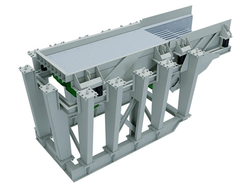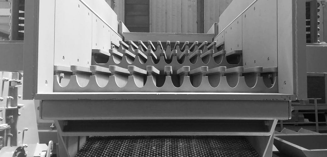 Первичные вибрационные питатели могут быть оборудованы колосниковыми решетками, которые уменьшают количество мелкозернистого материала, поступающего в дробилку, путем его скальпирования в процессе подачи. Расстояние между колосниковыми стержнями можно отрегулировать в соответствии с применением.
